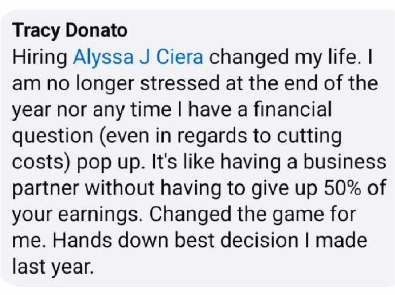 'She's helped me understand where each penny is going. I make better decisions on where I can cut expenses, how to improve my offerings, keep my payroll in check, and how to create a great experience for my clients without breaking the bank.'